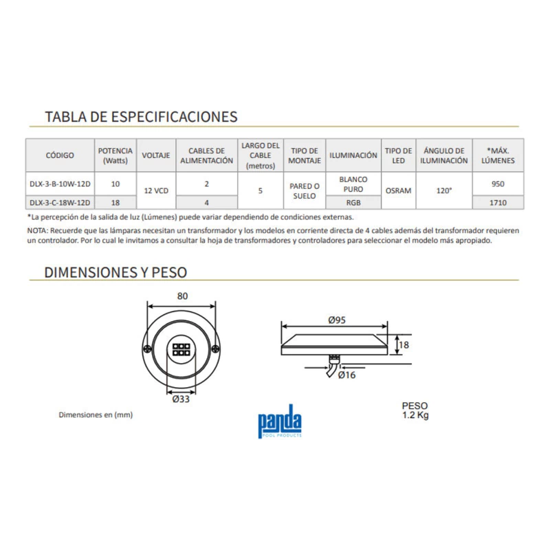 Características Este modelo necesita un transformador (corriente directa), por lo cual le invitamos a consultar la sección de los transformadores para lámparas LED serie DELUXE